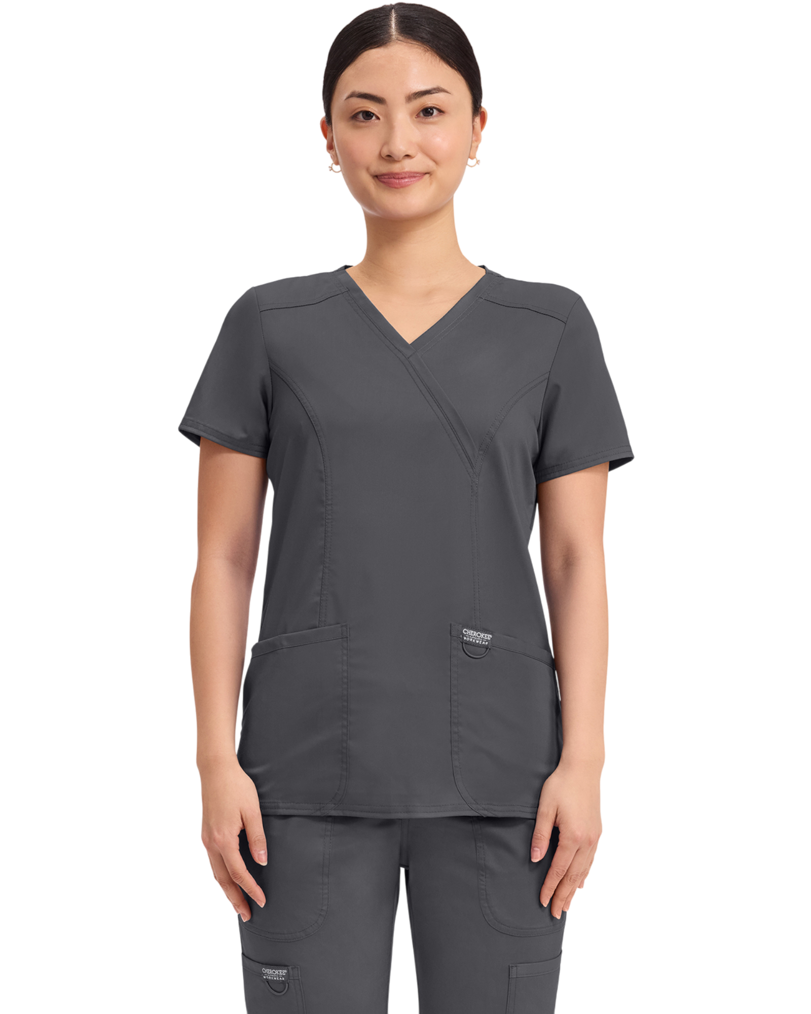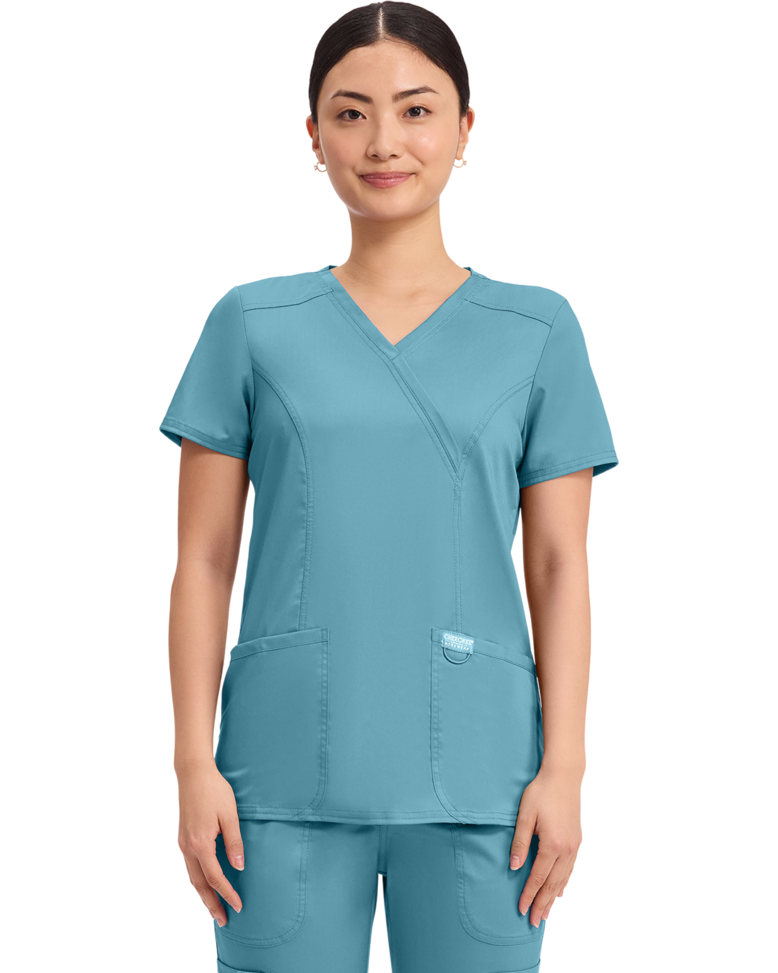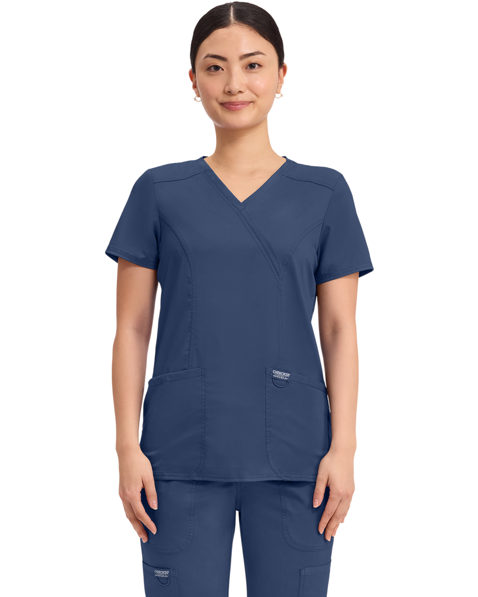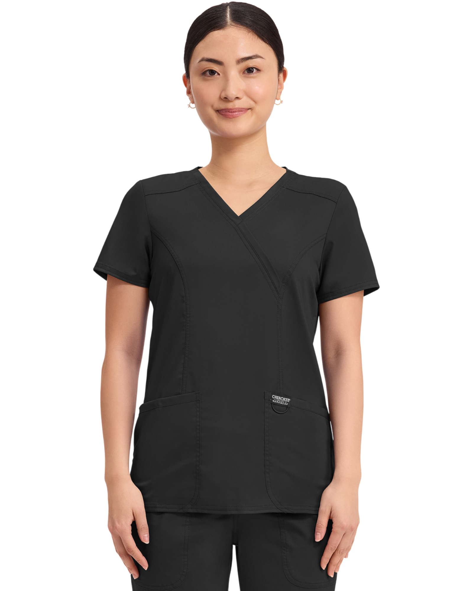 Cherokee Revolution Collection: A Modern Classic fit mock wrap top features front shoulder yokes, two patch pockets, instrument loop, logo label with bungee loop, front and back princess seams and side vents.