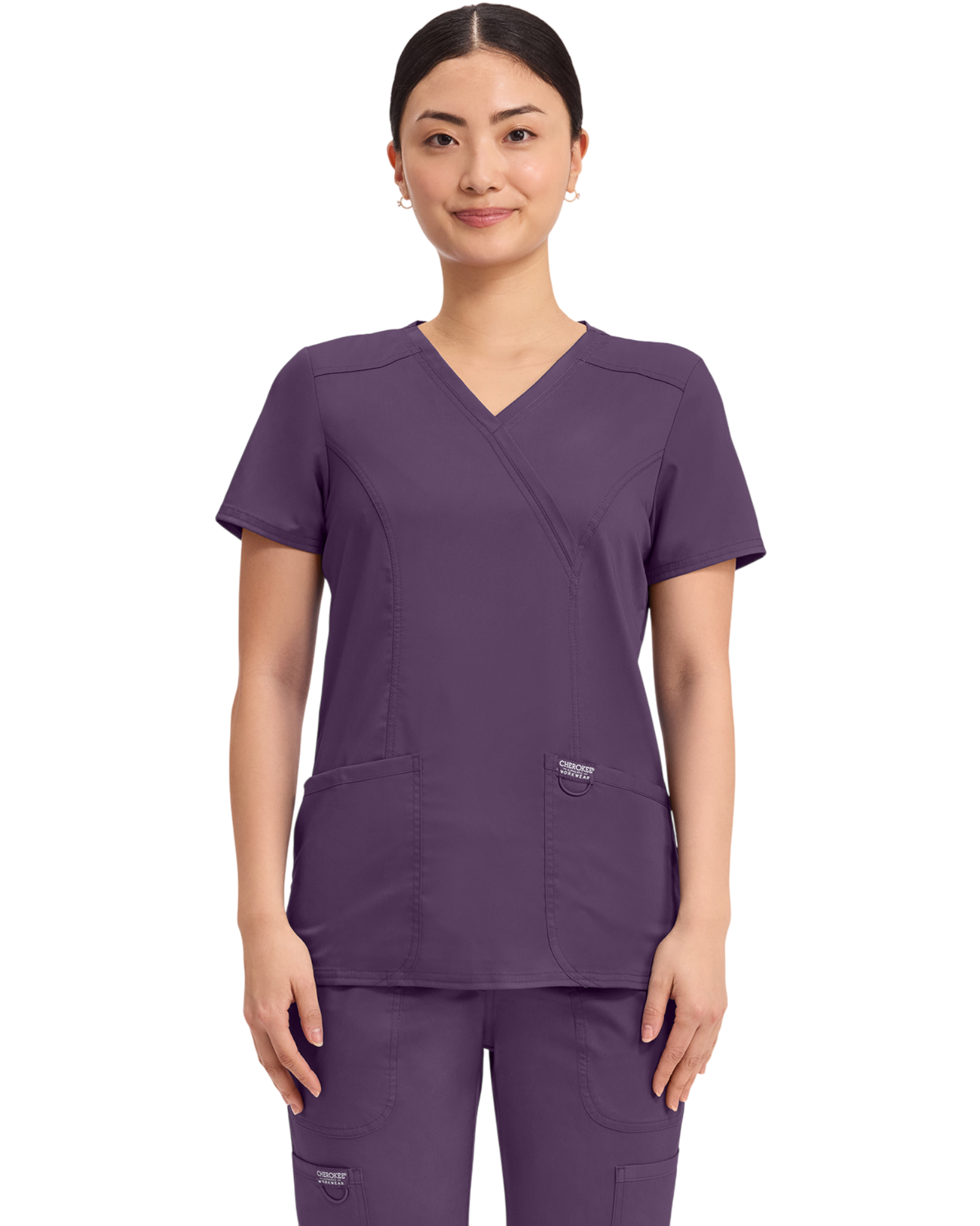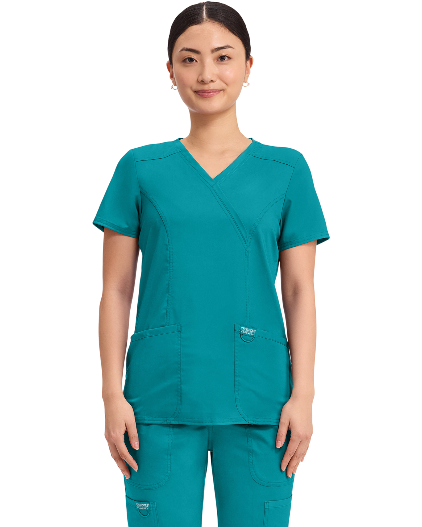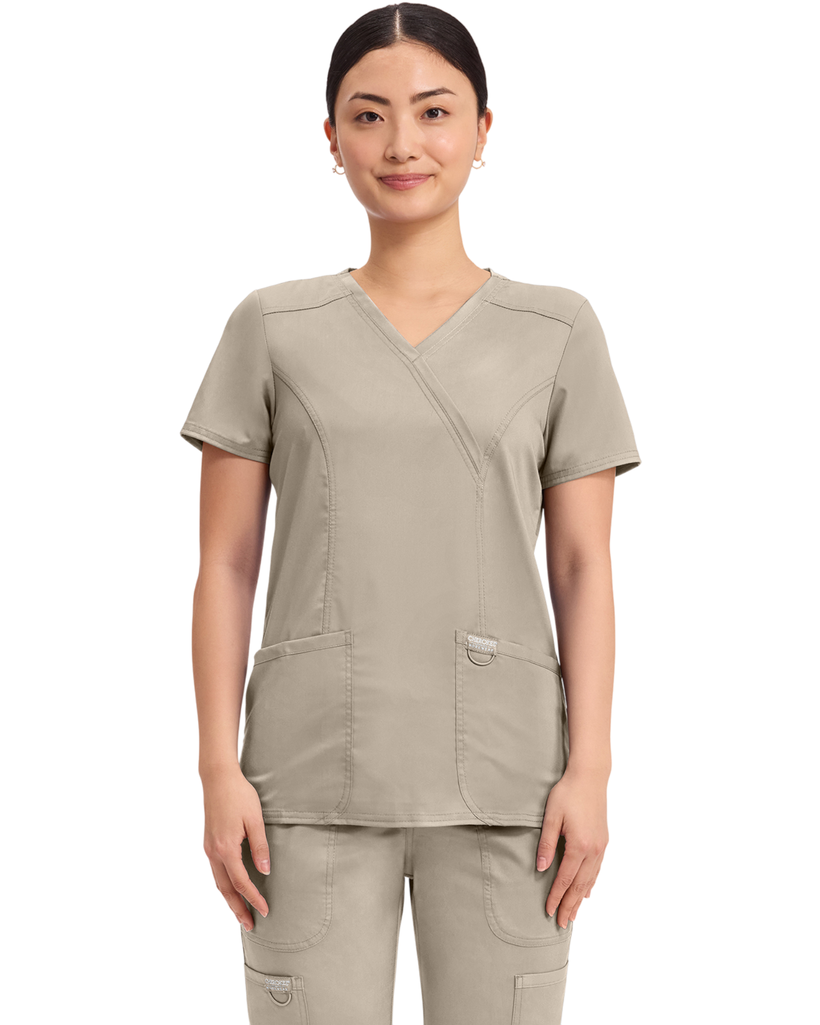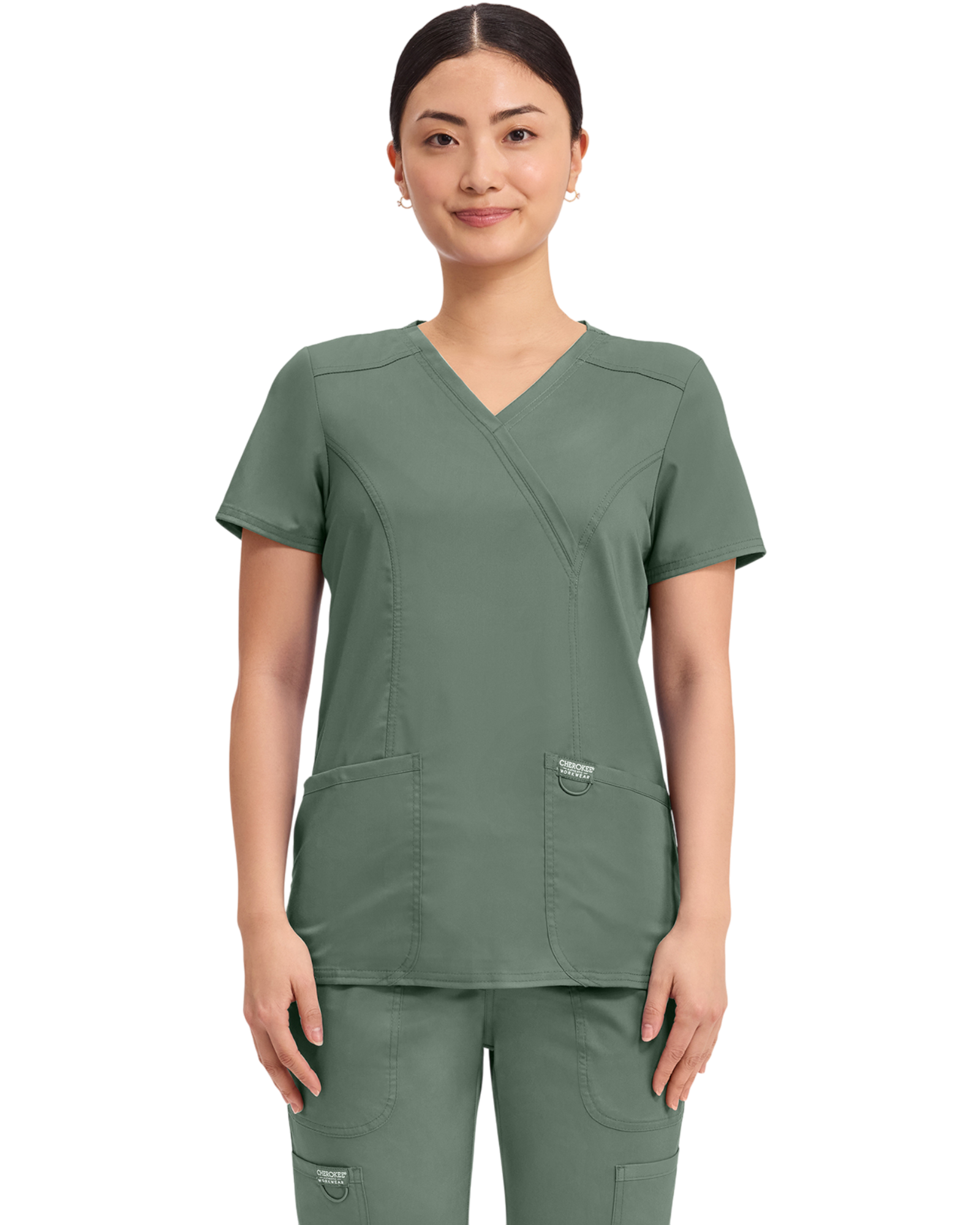 Cherokee Revolution Collection: A Modern Classic fit mock wrap top features front shoulder yokes, two patch pockets, instrument loop, logo label with bungee loop, front and back princess seams and side vents.