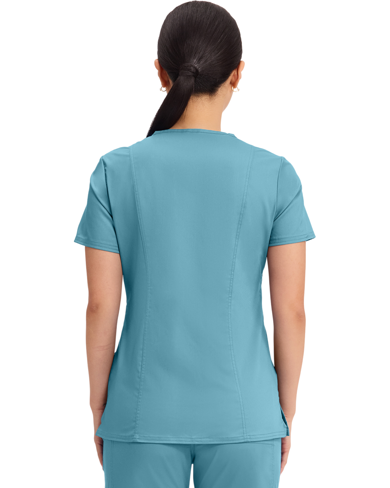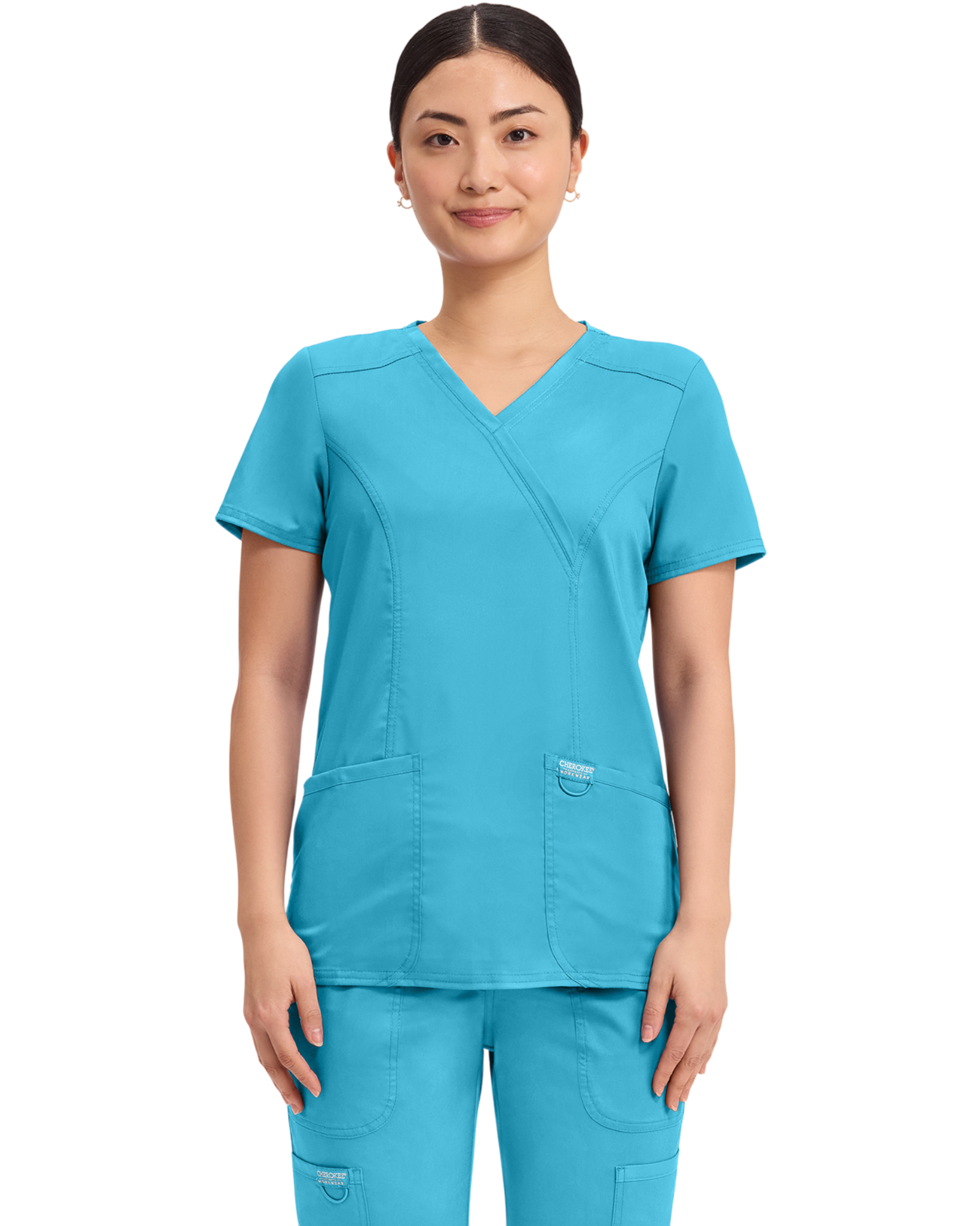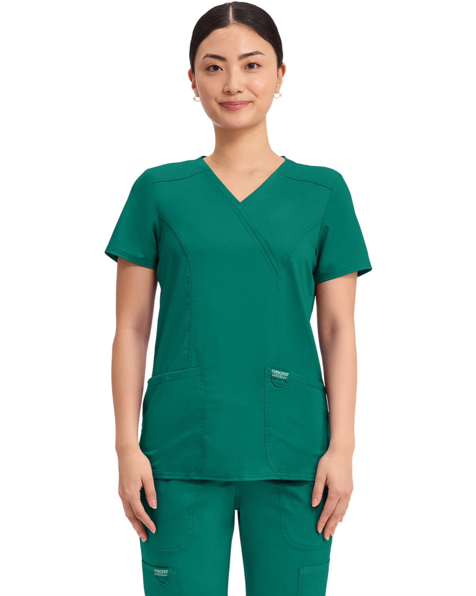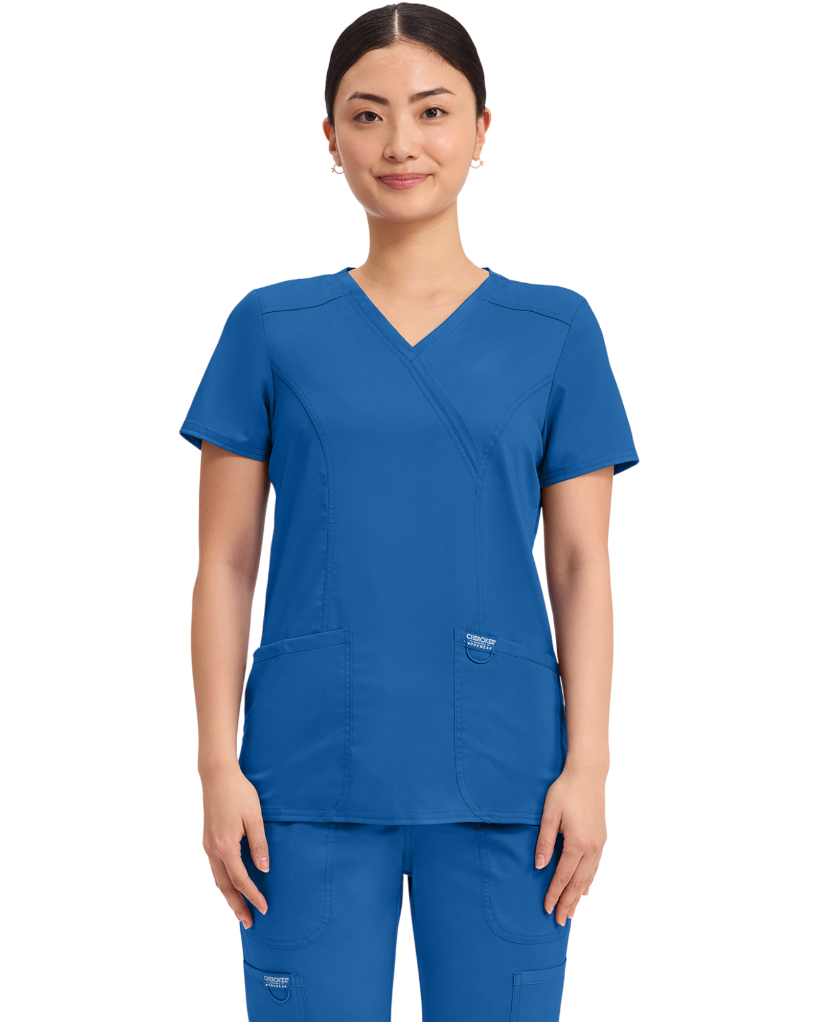 Cherokee Revolution Collection: A Modern Classic fit mock wrap top features front shoulder yokes, two patch pockets, instrument loop, logo label with bungee loop, front and back princess seams and side vents.