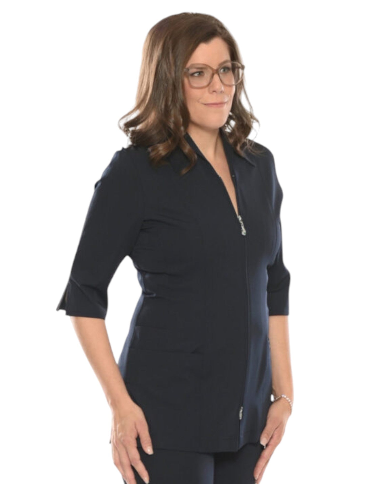 Short blazer, zipper 3/4 sleeves with slits, with small pocket in one of the large pockets. The Liviera fabric is high performance stretchy and strong with a climate controlled comfort. With increased durability and easy maintenance, it retains its color even after many washes.