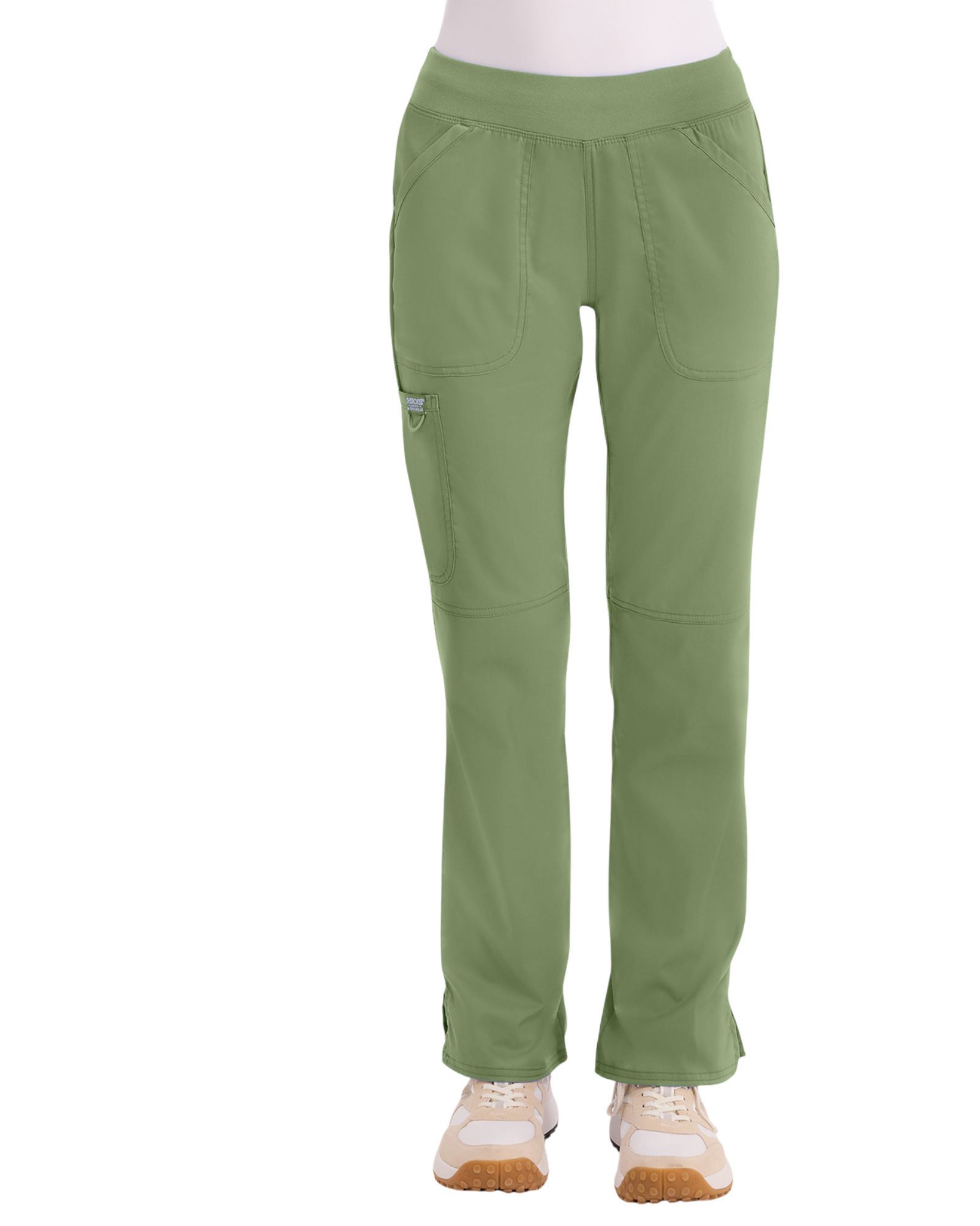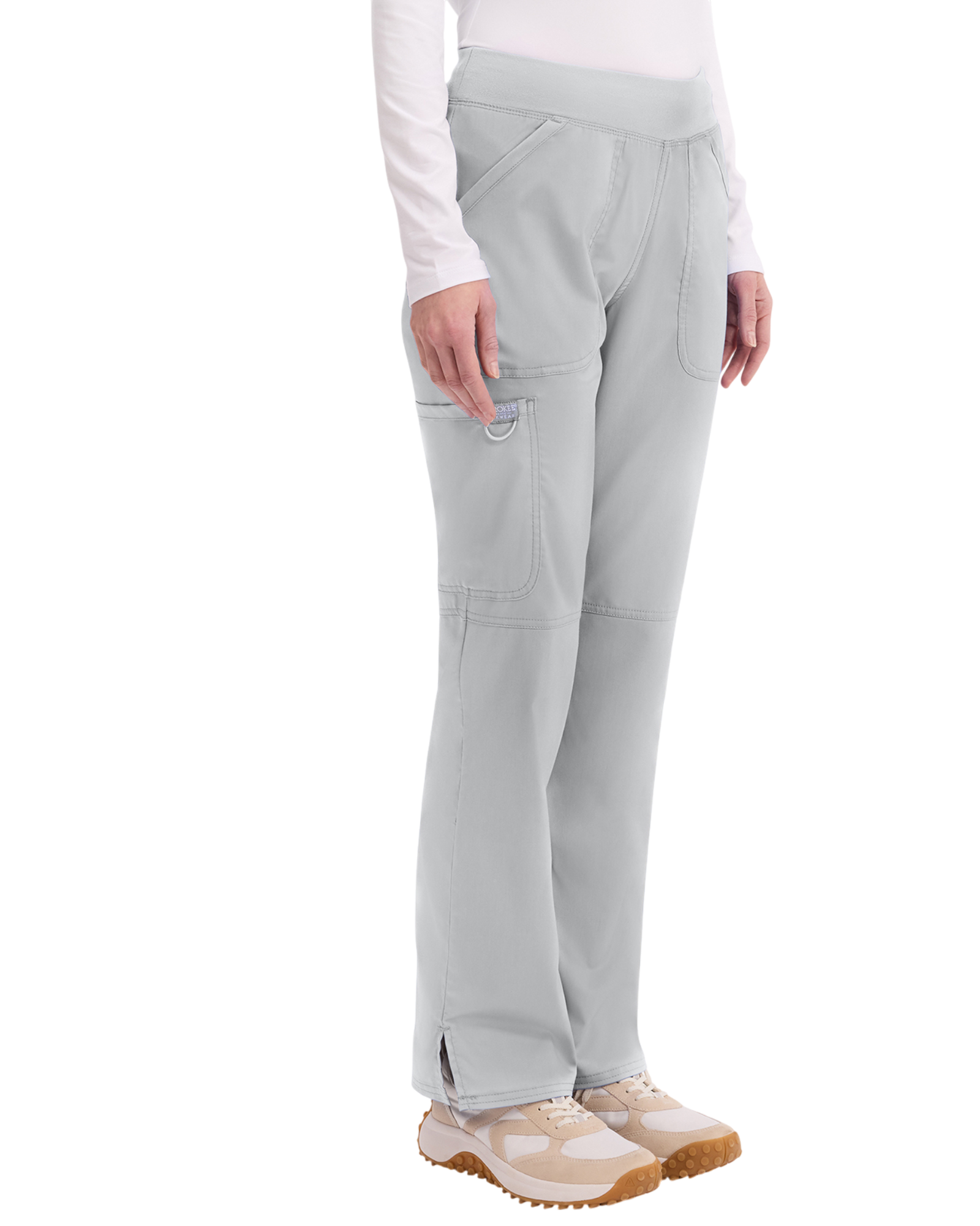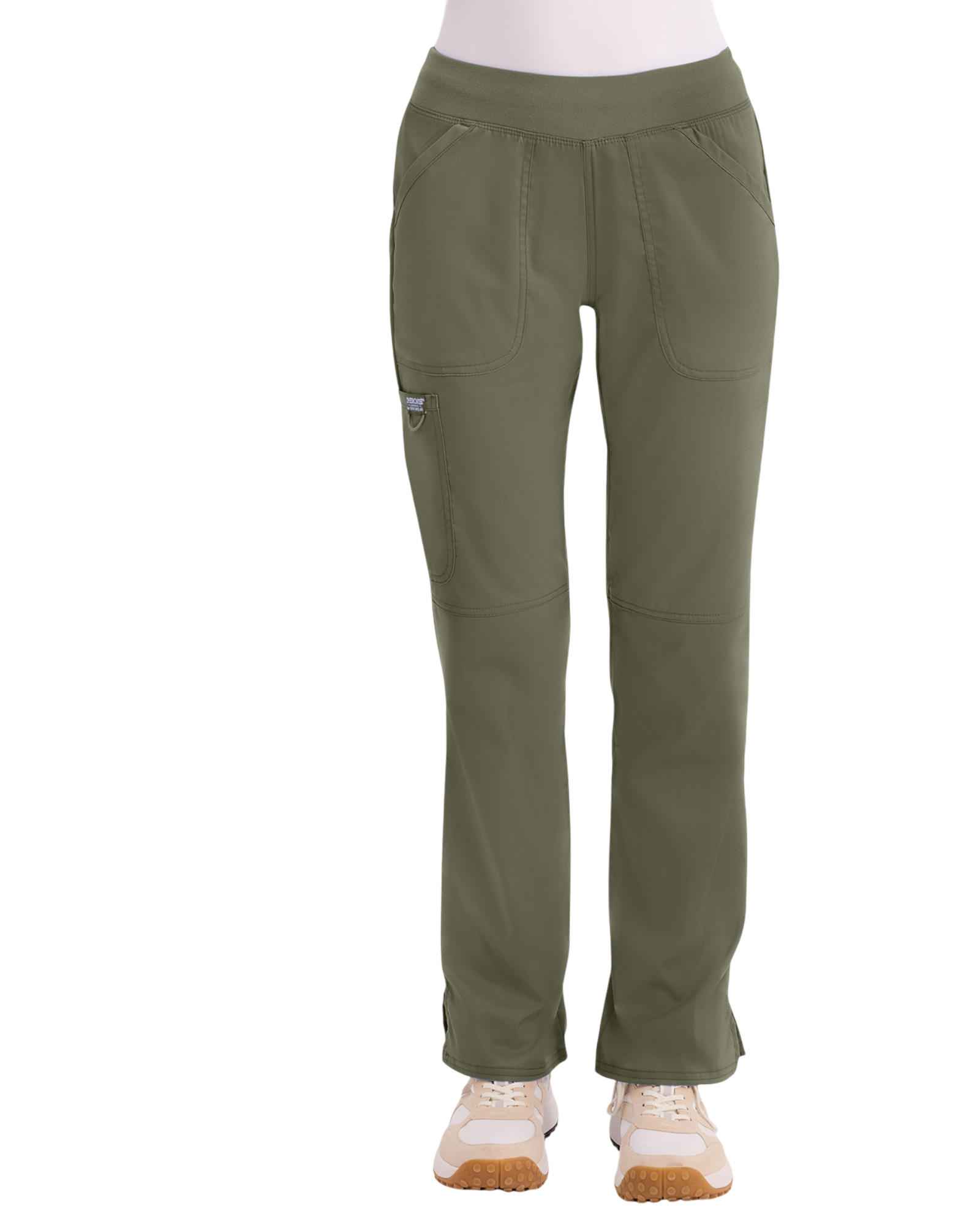 Cherokee Revolution Collection: modern classic pants with a mid-rise waist and slightly flared legs, featuring a functional drawstring and elastic waistband at the back. They also have patch pockets at the front, two cargo pockets, a logo label with elastic loop, a back pocket, and side slits.