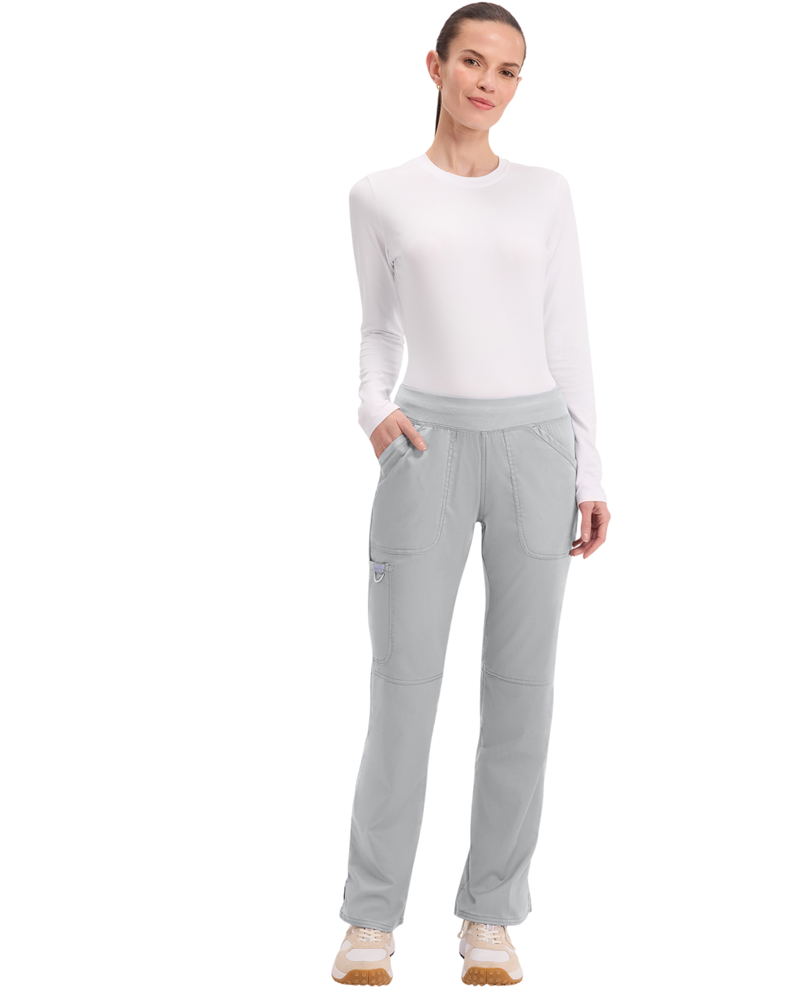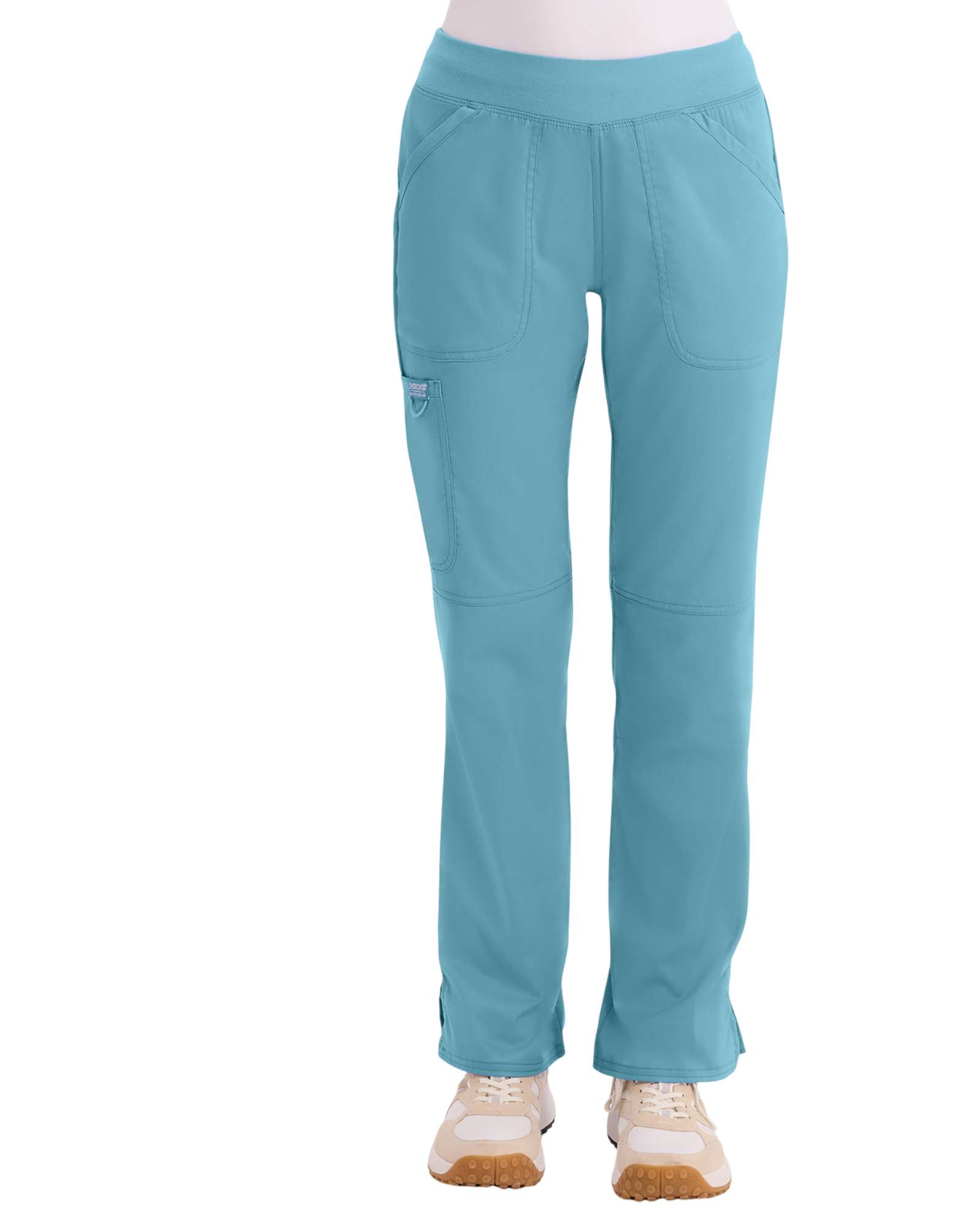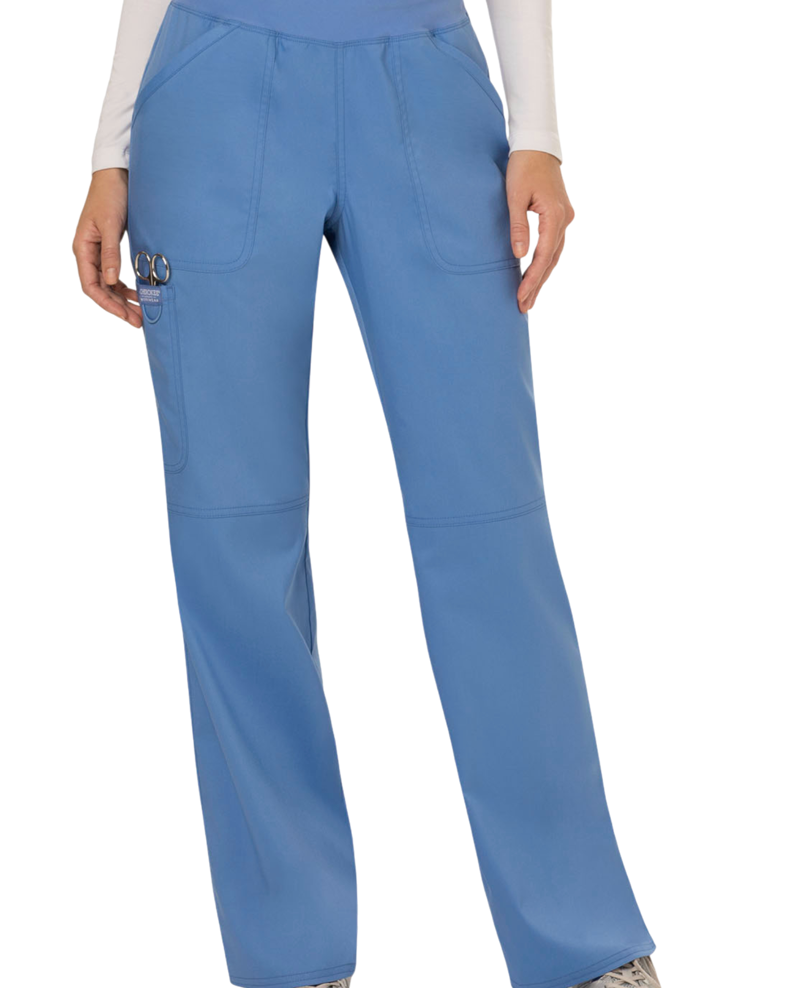 Cherokee Revolution Collection: modern classic pants with a mid-rise waist and slightly flared legs, featuring a functional drawstring and elastic waistband at the back. They also have patch pockets at the front, two cargo pockets, a logo label with elastic loop, a back pocket, and side slits.