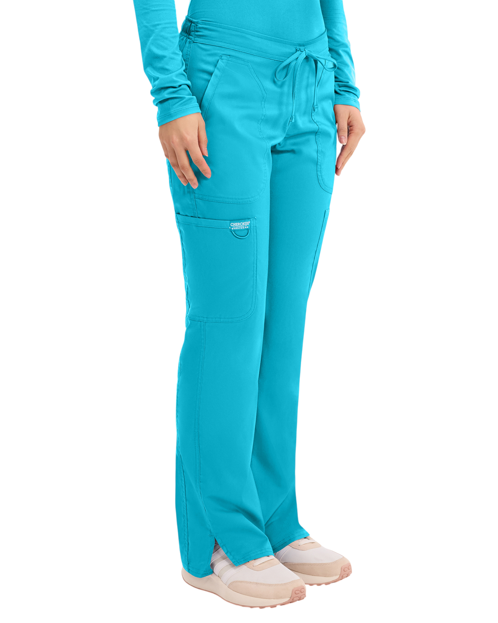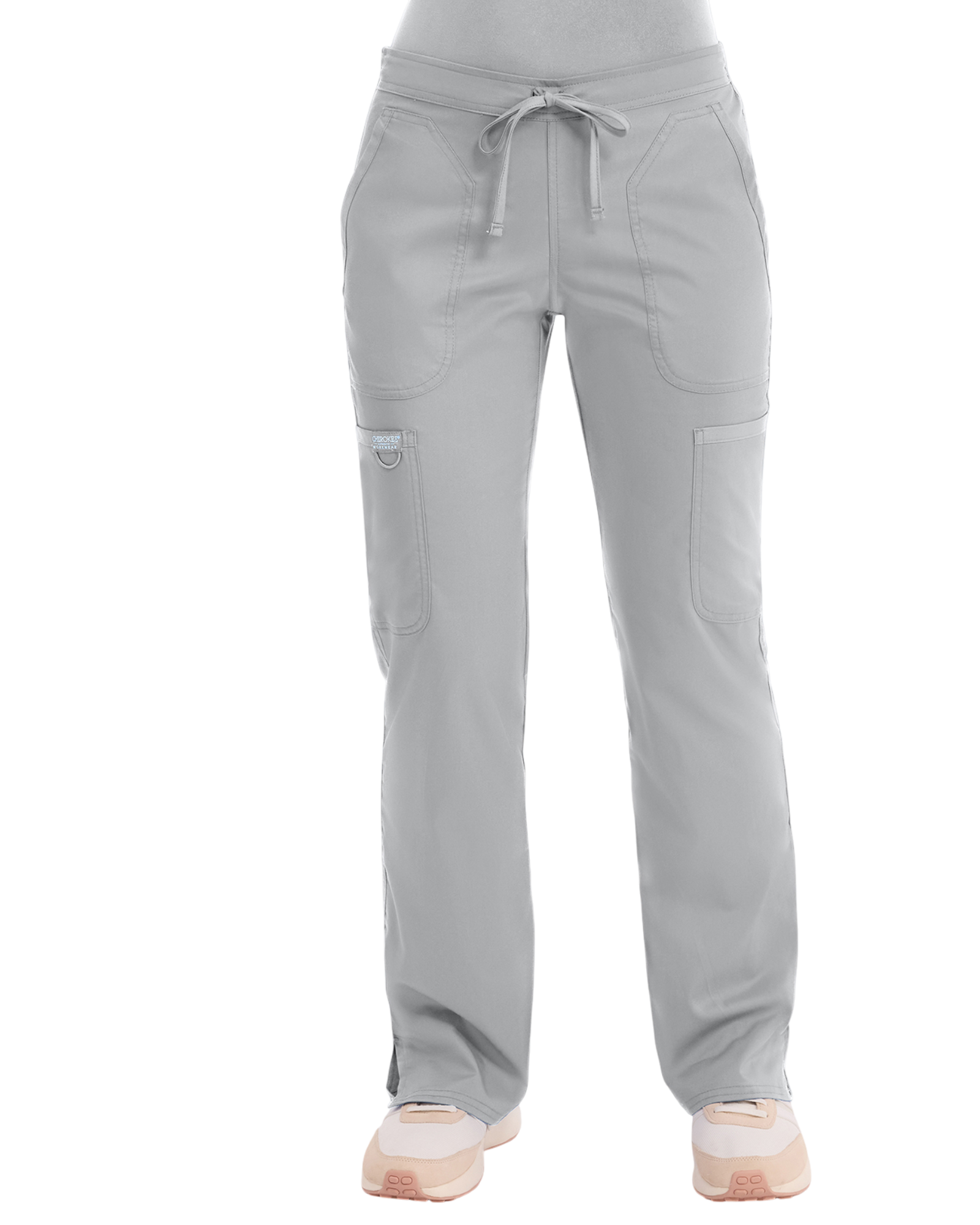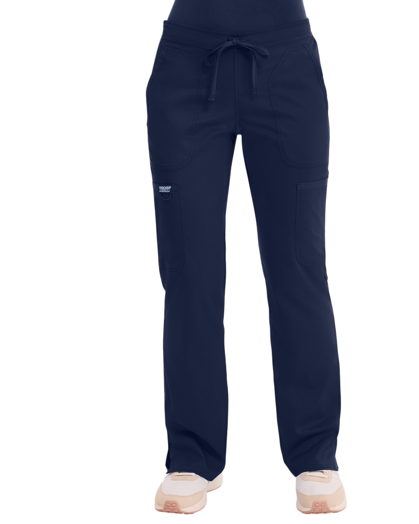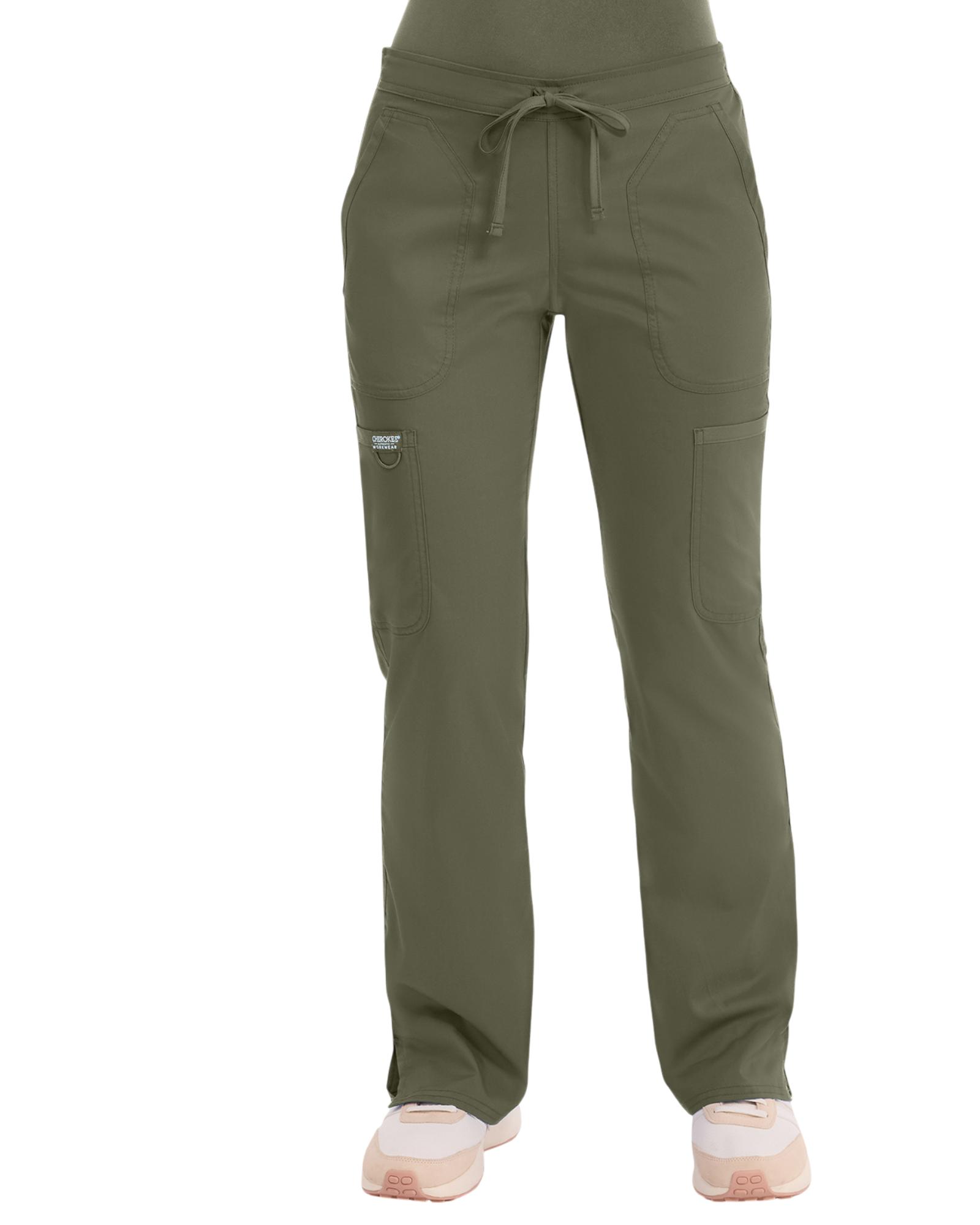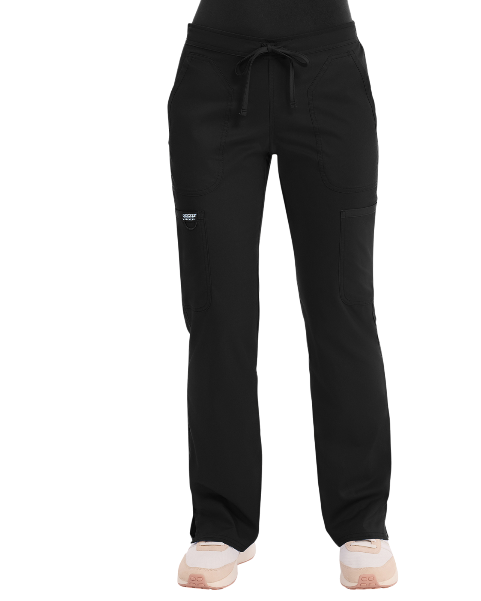 Cherokee Revolution Collection: A Modern Classic fit, mid rise, moderate flare leg pant features a functional drawstring and back elastic waistband. Also featured are front patch pockets, two cargo pockets, a logo label with bungee loop, back pocket and side vents.