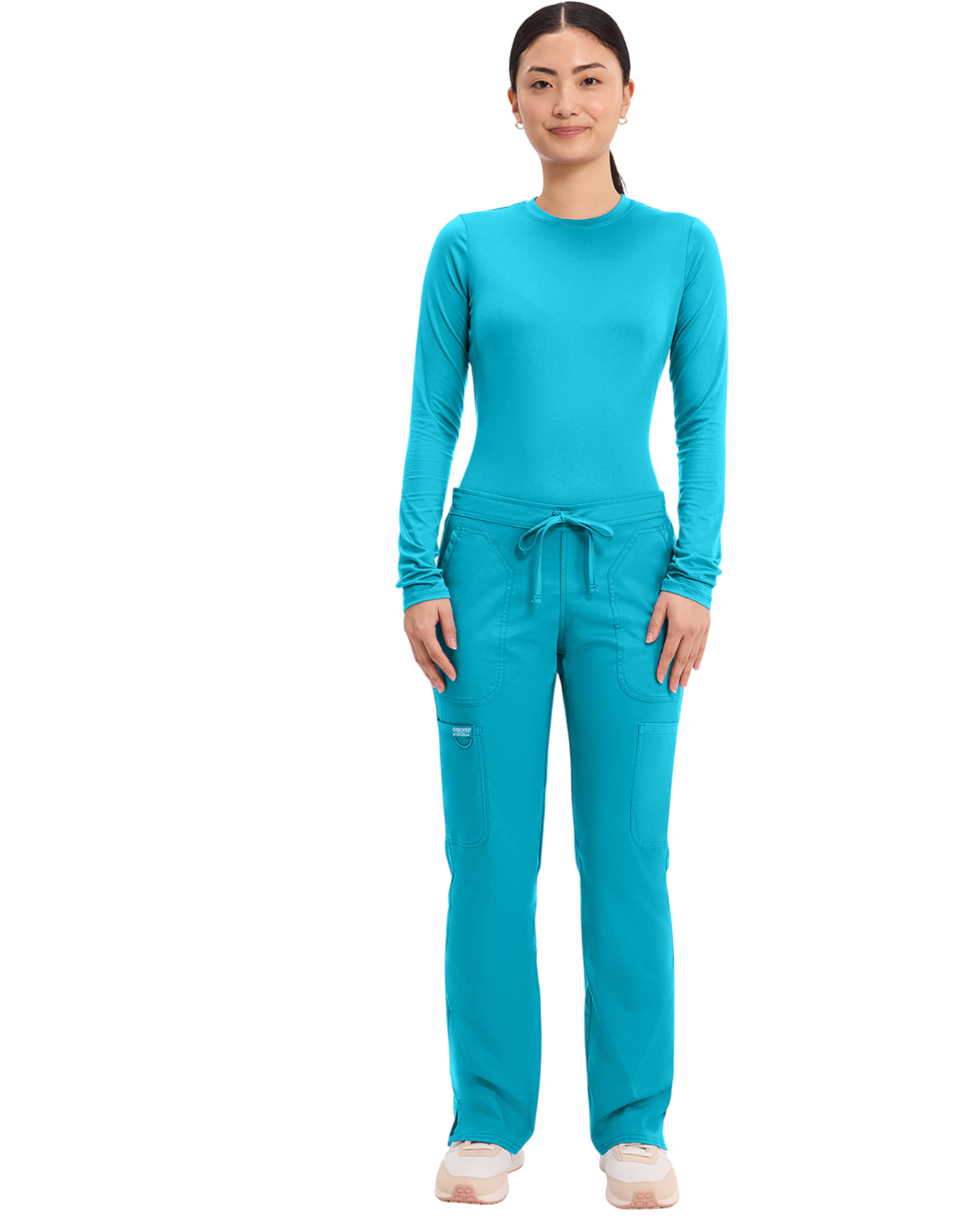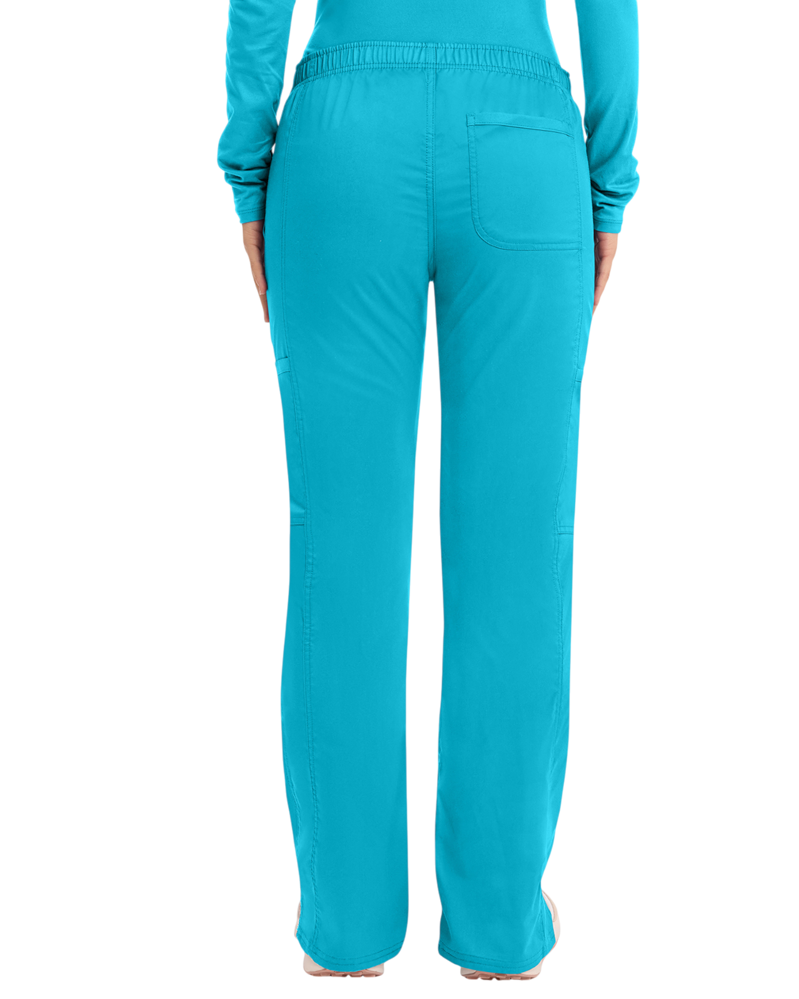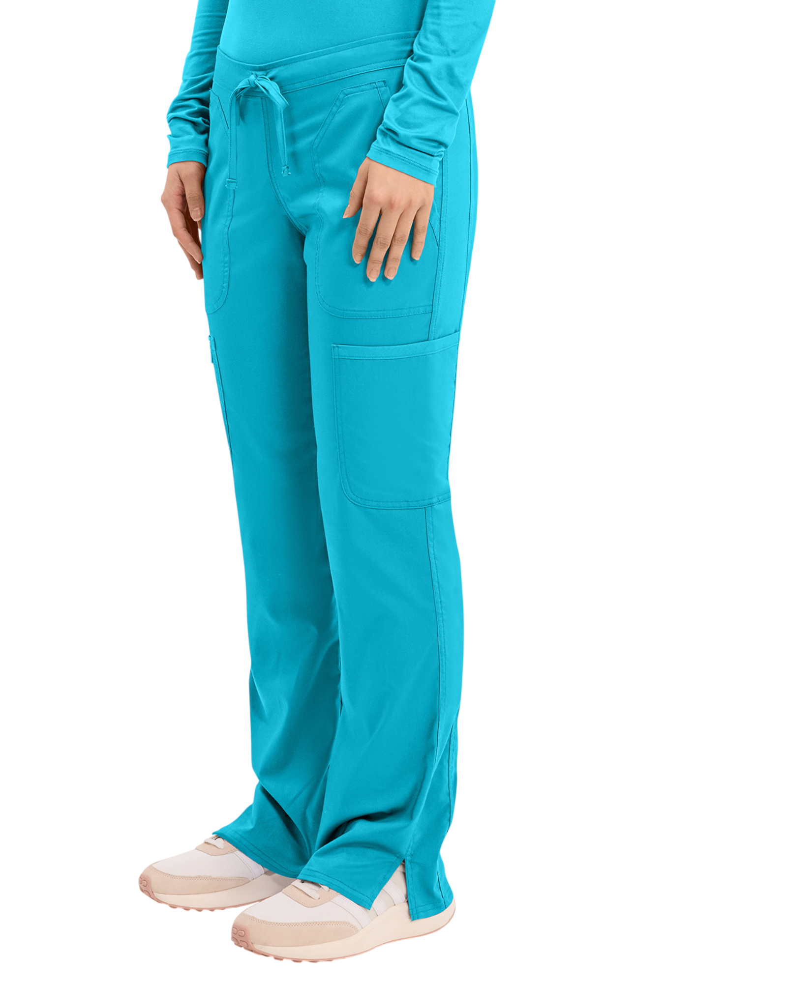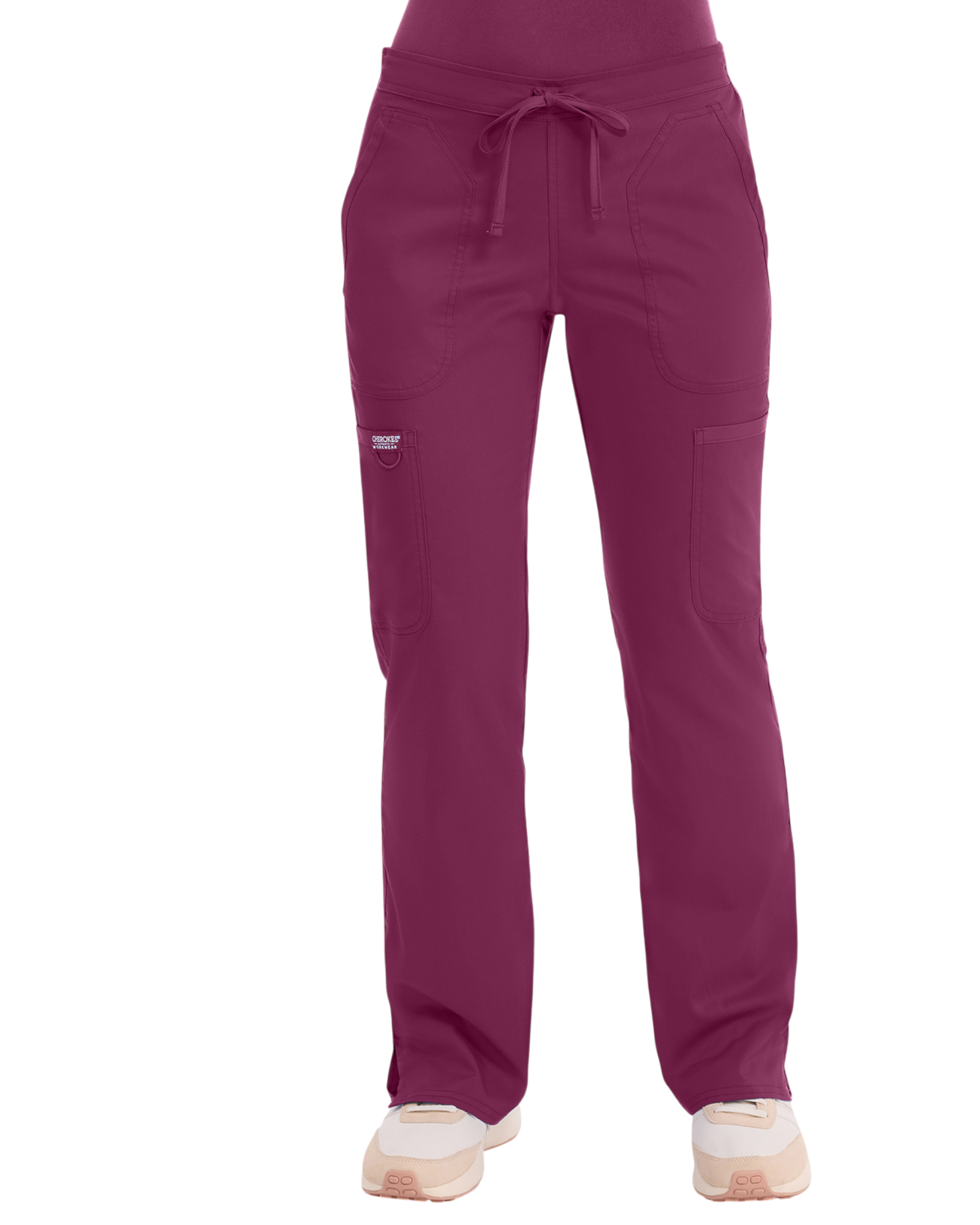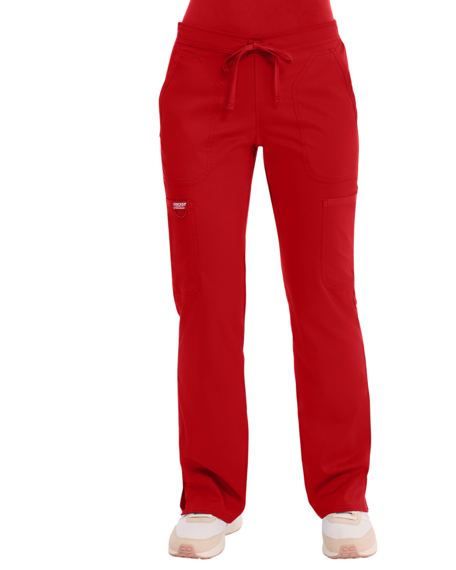 Cherokee Revolution Collection: A Modern Classic fit, mid rise, moderate flare leg pant features a functional drawstring and back elastic waistband. Also featured are front patch pockets, two cargo pockets, a logo label with bungee loop, back pocket and side vents.