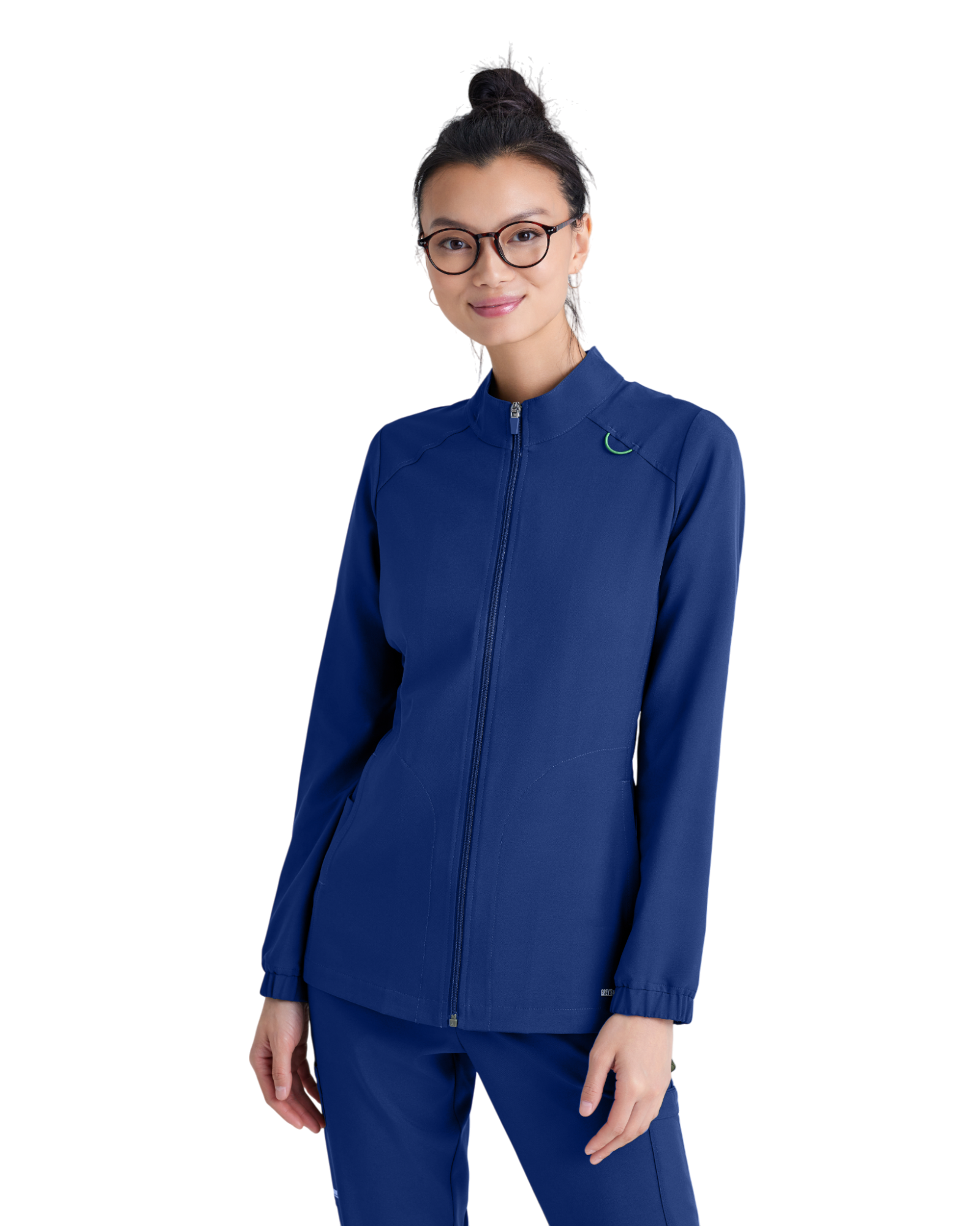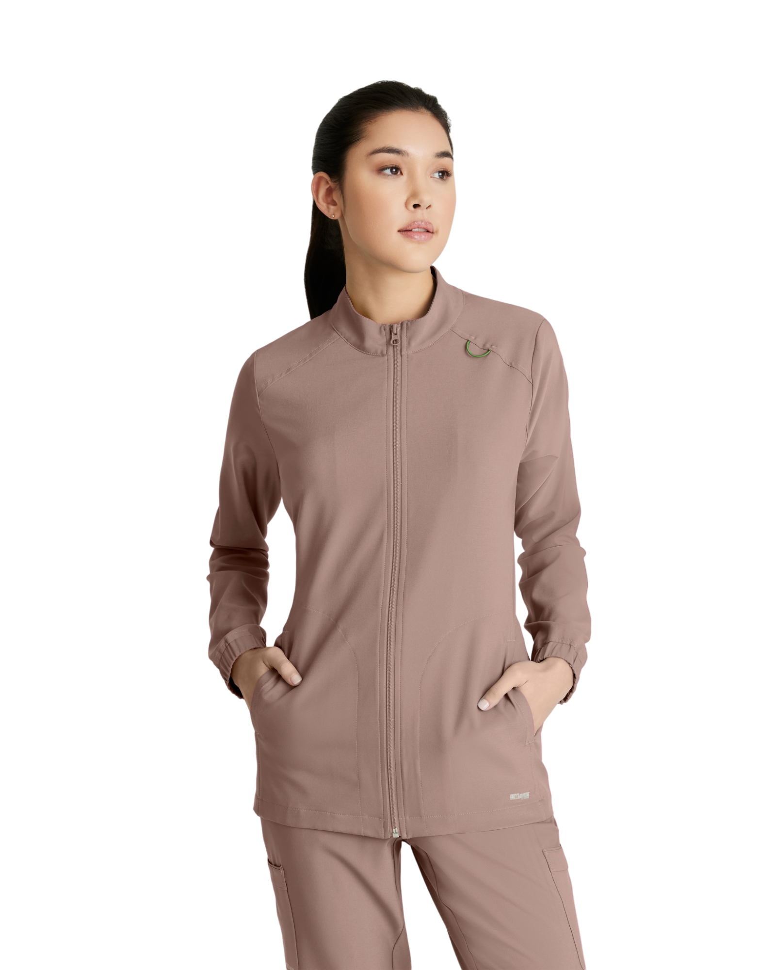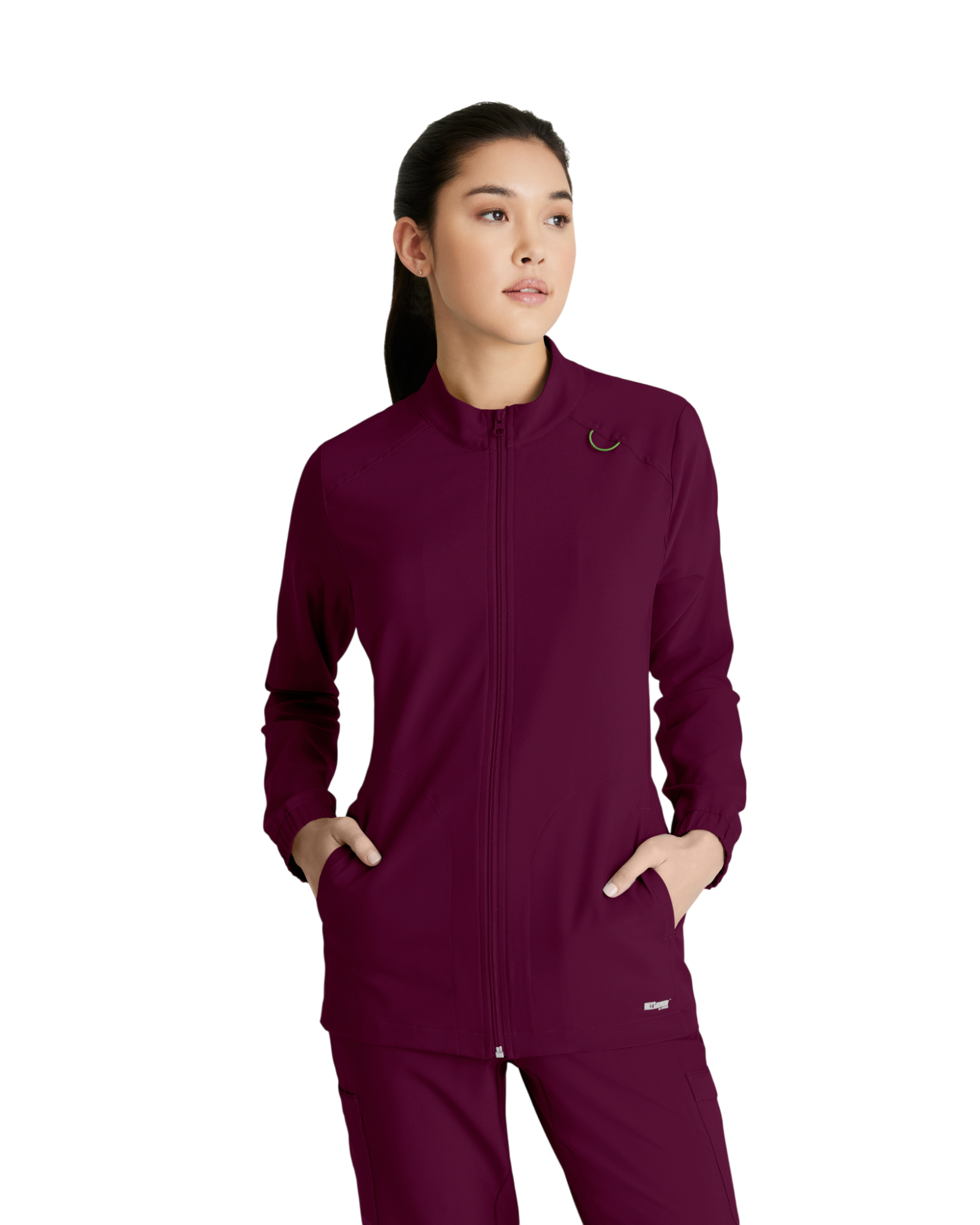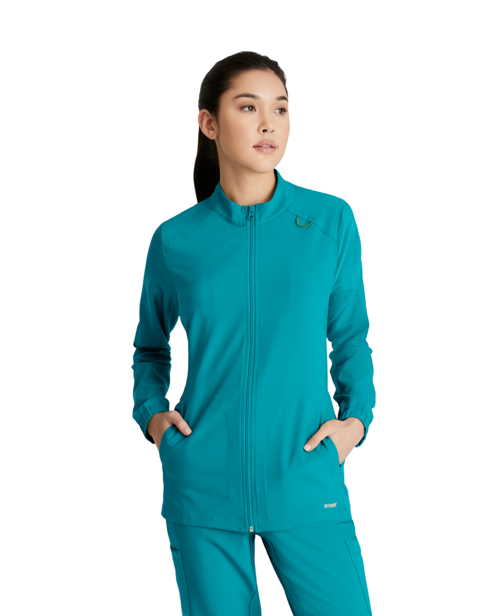 Complete your favorite Grey's Anatomy by Barco Evolve scrub set with the athleisure-inspired Virtue warmup. Featuring two spacious pockets and a signature green badge loop to keep important items close by. Made with recycled polyester and CiCLO® technology, the fabric is soft, stretchy, and breathable for all-day comfort.